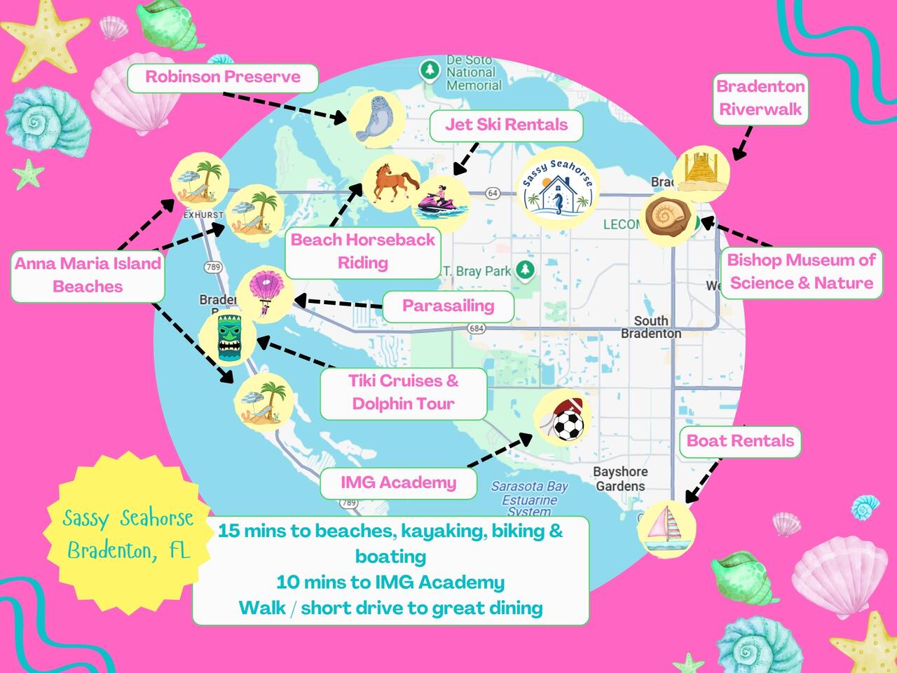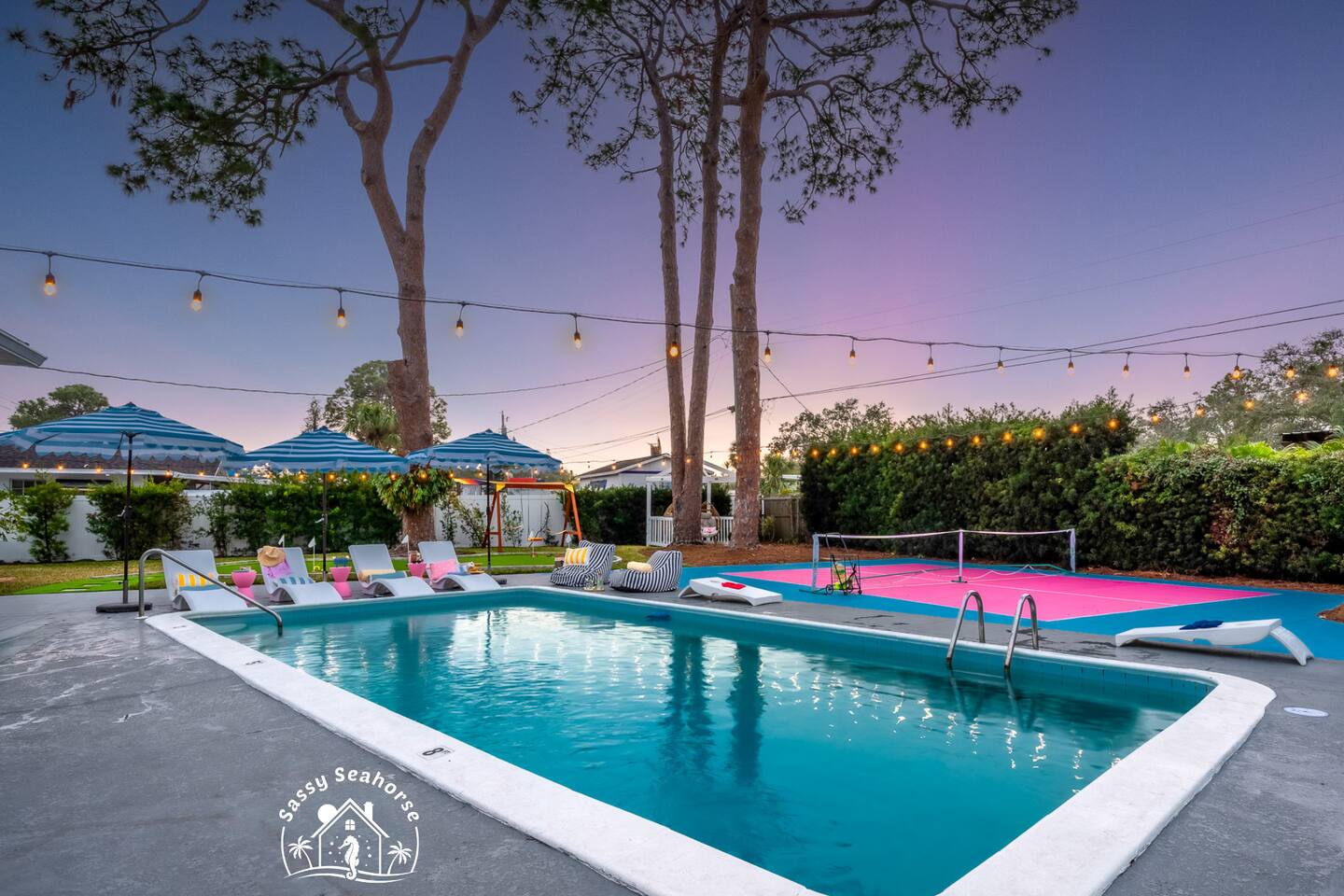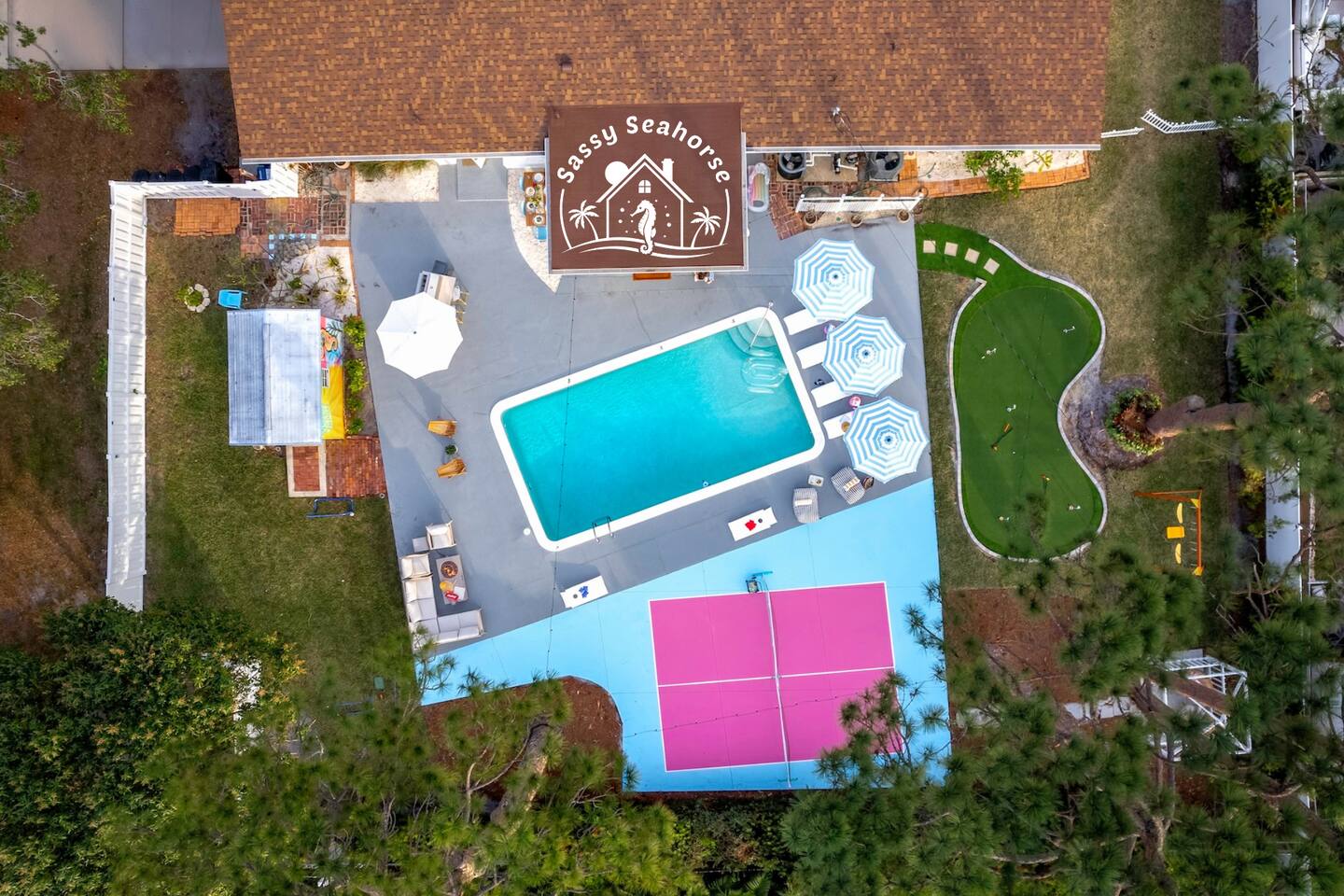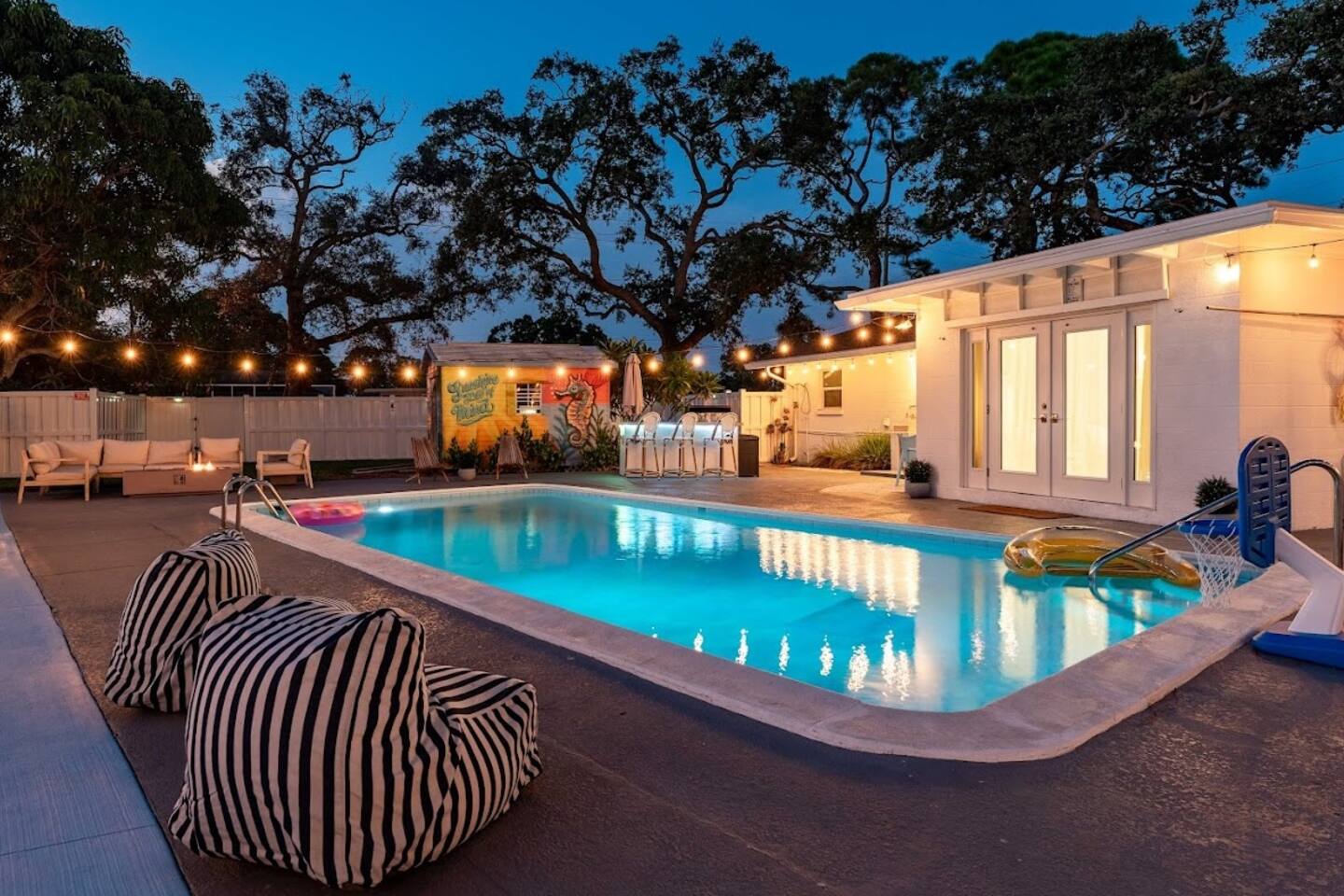 Welcome to Sassy Seahorse Bradenton – Your Ultimate Beachtown Getaway! We’re proud to be a Superhost with~200 five-start reviews! This is our newest listing, and we can’t wait for you to experience it. What our guests are saying: "With so many amenities there was a lot to do right at the house. The kids loved it and jumped from one activity to the next. We went to a variety of nearby beaches which were about 15 min drive. There was beach essentials to borrow in the shed which is so appreciated when traveling with kids. Host was proactive with communication and also very responsive when I reached out. You can tell they go above and beyond to ensure you have a great stay." - Jaclyn, Dec. 2025 **Prime Location** 📍 Quiet residential neighborhood near beaches, restaurants & shops 📍 7 miles/15 mins to Anna Maria Island Beaches & outdoor adventures (kayaking, biking, boating, swimming & beach horseback riding) 📍 5 miles/10 mins to IMG Academy for attending events, camps, or training 📍 Ample parking for up to 4 vehicles 🌊 Year-round Heated Pool with NO heating fee + Pool Basketball Hoop (pool size 16'x30', see below for pool temp details) 🏓 Pickleball Court: 18.25' x 28' – non-regulation but perfect for casual play ⛳️ Glow Mini Golf putting green 🎬 Outdoor Movie Nights: 150” screen, portable projector + Fire TV Stick for Netflix streaming 🎨 IG-Worthy Murals: Hand-painted by a talented local artist 🔥 BBQ with gas grill and Bluetooth sound system 🪑 Cozy Lounge: Plush sofa, gas firepit, outdoor dining, luxury loungers, umbrellas, bean bags, a Gazebo w/ Egg Chairs 🧒 Kids’ Swing Set: Hours of fun for little ones 🎲 Games Galore: Cornhole, mini soccer, jumbo Scrabble & beach themed Jenga 🏖 Beach Accessories: Towels, chairs, cooler & toys (Pool heat is maintained at 86°F but may vary and cannot be guaranteed if weather drops below 60°F.) **Indoor Fun & Entertainment** 🎥 Theater/Arcade Room: 8 electric recliners, 86” Smart TV & LG sound system, popcorn station, Simpsons arcade & 14 classic Pac-Man games 🏓 3-in-1 Game Table: Pool/Ping Pong/extra dining table 🛋 Living Room: 60” TV & ample plush seating 🍽 Spacious Dining: Seats 12, plus 4 high chairs at the kitchen island 👩🍳 Chef’s Kitchen: Fully equipped for all your cooking needs 💻 400+Mbps WiFI + Remote Workstations: 3 dedicated workspaces in separate bedrooms 🛏 Sleeps 12 | 4 Bedrooms + Bonus Room | 3 Bathrooms 🌟 Master: King bed (sleeps 2) 🌟 King + Twin: King & Twin bed (sleeps 3) 🌟 Blue Room: King bed (sleeps 2) 🌟 Bunk Room: Twin over Full (sleeps 3) 🌟 Bonus Room: Queen Murphy bed overlooking the swimming pool (sleeps 2) 🌟 Extra: Self-inflating Queen air mattress available upon request (sleeps 2) 🌟 Mattress topper on each King bed and a smart TV in every bedroom! 👶 Family-friendly: Pack 'N Play, booster highchair & children dinnerware 🐶 Dog-friendly: 2'x3' dog kennel, dog bowls & lawn area for dogs; see pet approval requirements below) 💼 Concierge Services To Elevate Your Stay 💆 In-Home Massage 👨🍳 Private Chef 🎉 Party Decor, Flower & Cake Delivery 🧘🏻♀️ Private Yoga 📸 Professional Photography Prioritizing Guest Safety, this home is equipped with smoke and carbon monoxide detectors, fire extinguishers, and pool door alarms to enhance child safety. ✨ Book Sassy Seahorse now for a luxurious Bradenton beachtown retreat! ⚠️ PLEASE NOTE 🕒 Instant Booking No reviews from other hosts yet? Please reach out to connect before booking. 📝 Rental Agreement, ID & Security Deposit Hold Within 2 days of bookings, we ask the booker to complete a rental agreement and ID verification for local compliance. Guests are required to either authorize a refundable temporary $500 security deposit hold (not a traditional security deposit, not an actual charge, released if no damage/excessive cleaning), OR opt in for a $45 non-refundable damage waiver provided by a third-party insurance company. The optional damage waiver is $45 for stays up to 10 nights, with an additional $2 per day for stays longer than 10 nights. To make this process easy for you, we use a secure and very simple, app-free platform called Happy Guest. It is not an app, and you do not have to sign up for an account -- it’s a safe and secure website. It also gives you a guest portal with all the info about the home and all of our favorite local spots. 🐾 Vacationing with Pets Pet fee of $200 for up to 2 house-trained dogs ages 2+. For stays of over 10 nights, additional pet cleaning fees may apply due to increased cleaning requirements. • Proof of rabies vaccination & flea/tick medications required for pet approval • No cats or other pets • Provided: kennel (24"x36"), bowls, mat **************** 🌲 LOCAL RESTAURANTS & ATTRACTIONS **Nearby Beaches** - Bradenton Beach - Coquina Beach - Holmes Beach - Anna Maria Island **Restaurants** - The Rooftop Bar & Grill (Downtown Bradenton) - Anna Maria Oyster Bar - Tides Tiki Bar & Grill - O'Bricks Pub & Martini Bar - Mattison's Riverwalk Grille Enjoy the best of both relaxation and adventure, all just a short distance from Sassy Seahorse!