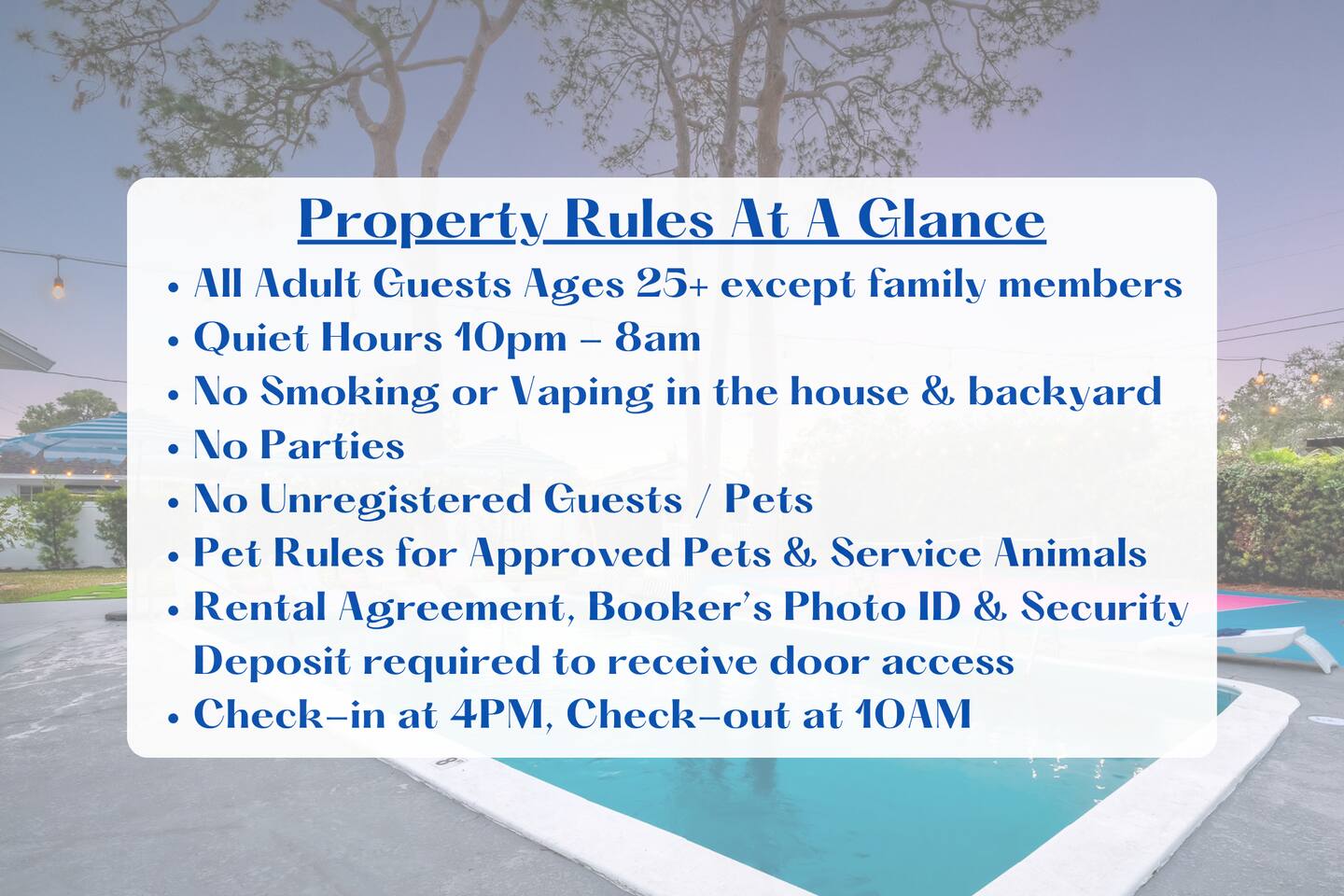 ~Check-in and Check-Out~ Standard check-in time is 4:00 PM and check-out is 10:00 AM. Early check-in and late check-out may be available for a small fee, subject to cleaning schedules. Availability is confirmed the day prior. ~Refunds~ We want your stay to be perfect, but please understand that we cannot issue refunds for factors beyond our control, such as weather conditions. We highly recommend guests purchase trip insurance. This Florida home features lush outdoor spaces. To help keep bugs and critters out, please keep doors and windows closed at all times. While we have regular professional pest control, occasional sightings of insects or small pests—especially outdoors—are possible and not uncommon in a natural setting. Pine needles in the backyard may fall between our weekly landscaping visits and are unfortunately unavoidable. Refunds will not be issued for pest encounters or outdoor debris. Additional cleaning may required for stays over 10 days. Please reach out to inquire about longer stays. Violations of our house rules may lead to guests having to leave prematurely without a refund. For property protection and insurance purposes, security cameras monitor the front and back entrances and must remain active at all times. To respect our neighbors, a noise monitoring device is installed indoors and outdoors to measure sound levels only—it does not record audio.