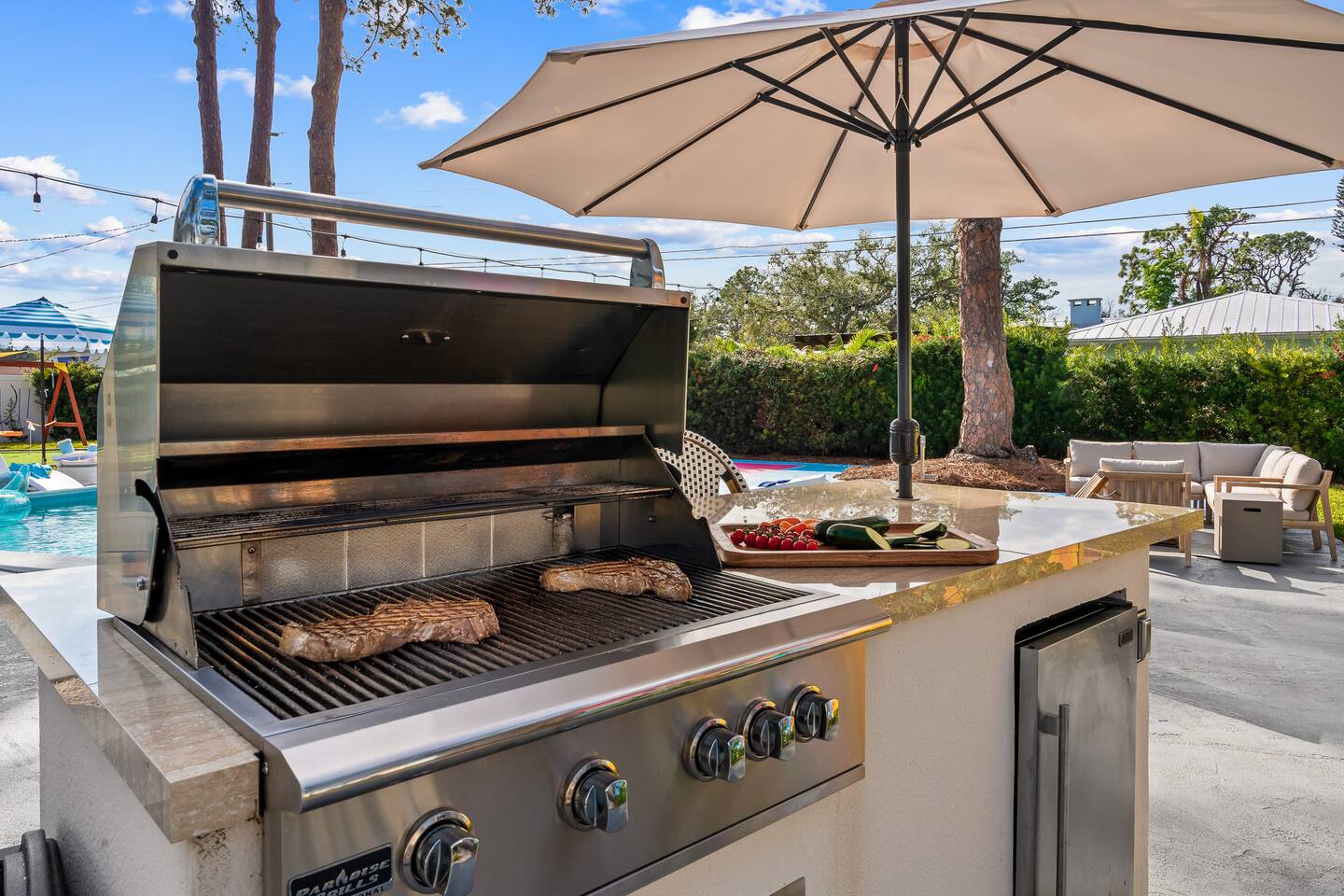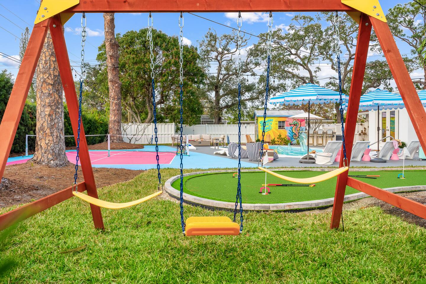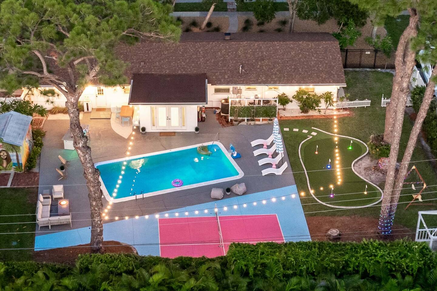 Escape the winter chill at Sassy Seahorse—your sun-soaked Florida getaway. Lounge by the heated pool, play pickleball, or enjoy mini golf in the backyard that glows at night. Enjoy family fun with a private movie theater, arcade, outdoor movies, BBQ dinners, and s’mores by the fire pit while watching the little ones swing and laugh. Cook gourmet meals in the fully equipped chef’s kitchen. Just 15 minutes from gorgeous beaches, IMG Academy, nature preserves, and outdoor adventures. Pups welcome!