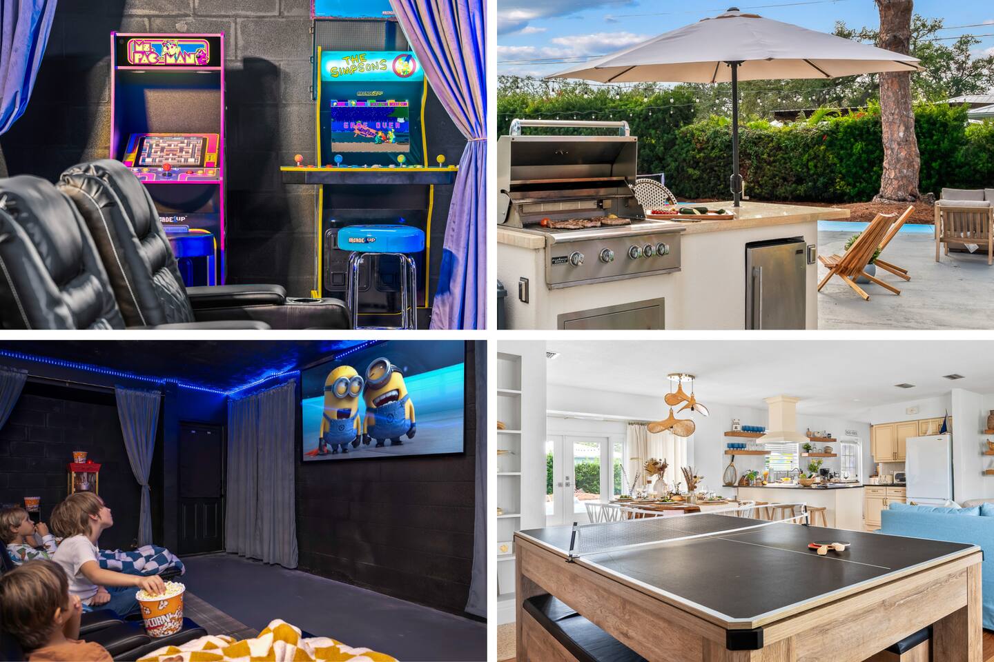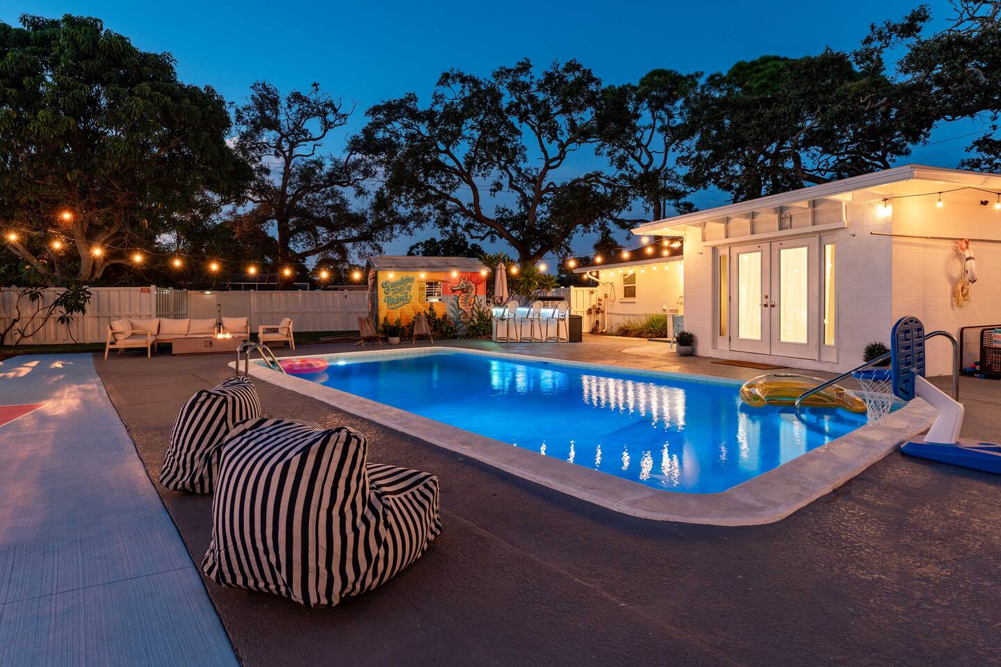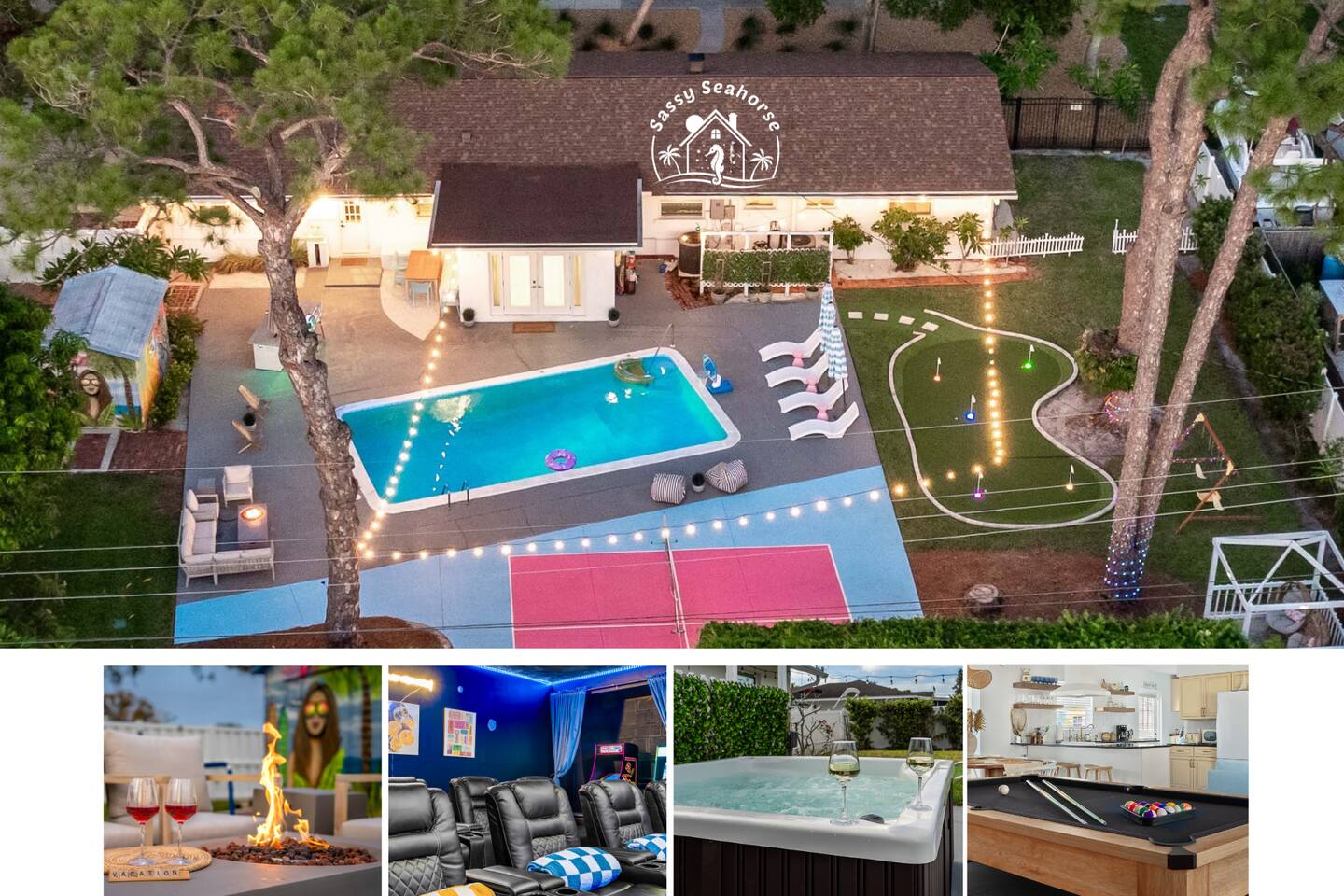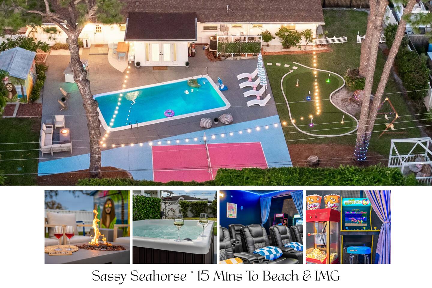 Escape to the Sassy Seahorse oasis! Splash in the heated pool, play pickleball or glow-in-the-dark mini golf, and unwind in the new hot tub for a true wellness reset. Enjoy family movie nights in the surround-sound theater with fresh popcorn and arcade games, fire up the BBQ for outdoor dining, and gather around the fire pit for s’mores. Inside, play pool or ping pong, cook in the chef’s kitchen, and relax in 3 king beds. Just 15 mins to AMI beaches (beach gear provided) and IMG. Dogs welcome!