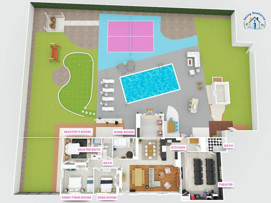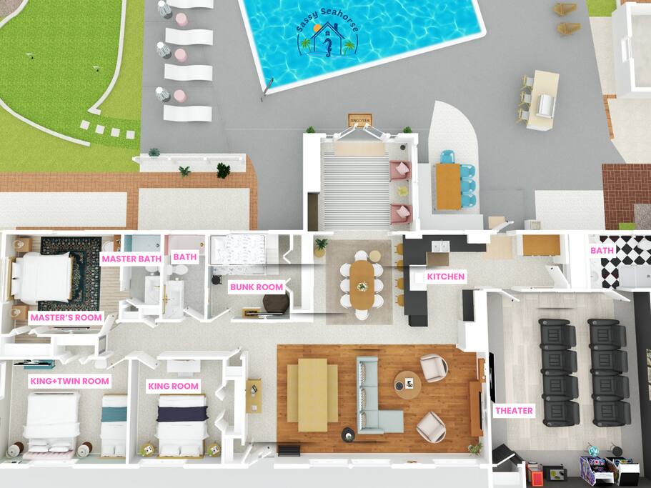 Welcome to Sassy Seahorse Bradenton – Your Ultimate Beachtown Getaway! We’re proud to be a Superhost with 160+ five-start reviews! This is our newest listing, and we can’t wait for you to experience it. What our guests are saying: “Our kids loved the outdoor fire pit, pool, mini golf, and pink pickleball court! The blinking colored pool and mini golf lights and music made every night feel like a private party! Indoors, the theater, arcade machines, ping pong table, and billiards were a wonderful treat!” - Belkis, Feb 2024 **Prime Location** 📍 Quiet residential neighborhood near beaches, restaurants & shops 📍 7 miles/15 mins to Anna Maria Island Beaches & outdoor adventures (kayaking, biking, boating, swimming & beach horseback riding) 📍 5 miles/10 mins to IMG Academy for attending events, camps, or training 📍 Ample parking for up to 4 vehicles 🌊 Year-round Heated Pool with NO heating fee + Pool Basketball Hoop (pool size 16'x30', see below for pool temp details) 🏓 Pickleball Court: 18.25' x 28' – non-regulation but perfect for casual play ⛳️ Glow Mini Golf putting green 🎬 Outdoor Movie Nights: 150” screen, portable projector + Fire TV Stick for Netflix streaming 🎨 IG-Worthy Murals: Hand-painted by a talented local artist 🔥 BBQ with gas grill and Bluetooth sound system 🪑 Cozy Lounge: Plush sofa, gas firepit, outdoor dining, luxury loungers, umbrellas, bean bags, a Gazebo w/ Egg Chairs 🧒 Kids’ Swing Set: Hours of fun for little ones 🎲 Games Galore: Cornhole, mini soccer, jumbo Scrabble & beach themed Jenga 🏖 Beach Accessories: Towels, chairs & toys (Pool heat is maintained at 86°F but may vary and cannot be guaranteed if weather drops below 60°F.) **Indoor Fun & Entertainment** 🎥 Theater/Arcade Room: 8 electric recliners, 86” Smart TV & LG sound system, popcorn station, Simpsons arcade & 14 classic Pac-Man games 🏓 3-in-1 Game Table: Pool/Ping Pong/extra dining table 🛋 Living Room: 60” TV & ample plush seating 🍽 Spacious Dining: Seats 12, plus 4 high chairs at the kitchen island 👩🍳 Chef’s Kitchen: Fully equipped for all your cooking needs 💻 400+Mbps WiFI + Remote Workstations: 3 dedicated workspaces in separate bedrooms 🛏 Sleeps 12 | 4 Bedrooms + Bonus Room | 3 Bathrooms 🌟 Master: King bed (sleeps 2) 🌟 King + Twin: King & Twin bed (sleeps 3) 🌟 Blue Room: King bed (sleeps 2) 🌟 Bunk Room: Twin over Full (sleeps 3) 🌟 Bonus Room: Queen Murphy bed overlooking the swimming pool (sleeps 2) 🌟 Mattress topper on each King bed and a smart TV in every bedroom! 👶 Family-friendly: Pack 'N Play, booster highchair & children dinnerware 🐶 Dog-friendly: 2'x3' dog kennel, dog bowls & lawn area for dogs; see pet approval requirements below) 💼 Concierge Services To Elevate Your Stay 💆 In-Home Massage 👨🍳 Private Chef 🎉 Party Decor, Flower & Cake Delivery 🧘🏻♀️ Private Yoga 📸 Professional Photography Prioritizing Guest Safety, this home is equipped with smoke and carbon monoxide detectors, fire extinguishers, and pool door alarms to enhance child safety. ✨ Book Sassy Seahorse now for a luxurious Bradenton beachtown retreat! ⚠️ PLEASE NOTE 🕒 Instant Booking No reviews from other hosts yet? Please reach out to connect before booking. 📝 Rental Agreement, ID & Security Deposit Hold This property has special local compliance requirements which include a signed rental agreement and the booker’s ID verification. Guests are required to either authorize a refundable temporary $500 security deposit hold (not a traditional security deposit, not an actual charge, released if no damage/excessive cleaning), OR opt in for a $45 non-refundable damage waiver provided by a third-party insurance company. The optional damage waiver is $45 for stays up to 10 nights, with an additional $2 per day for stays longer than 10 nights. To make this process easy for you, we use a secure and very simple, app-free platform called Happy Guest. It is not an app, and you do not have to sign up for an account -- it’s a safe and secure website. It also gives you a guest portal with all the info about the home and all of our favorite local spots. 🐾 Vacationing with Pets Pet Policy - Up to 2 house-trained dogs (age 2+) allowed with approval. A third may be considered for an additional fee. • No cats or other pets • Rabies vaccination & flea/tick prevention required • Add pets under “Guests > Pets” to apply the $200 pet fee excluding platform fees. • Provided: kennel (24"x36"), bowls, mat for pets **************** 🌲 LOCAL RESTAURANTS & ATTRACTIONS **Restaurants** - The Rooftop Bar & Grill (Downtown Bradenton) - Anna Maria Oyster Bar - Tides Tiki Bar & Grill - O'Bricks Pub & Martini Bar - Mattison's Riverwalk Grille **Nearby Beaches** - Bradenton Beach - Coquina Beach - Holmes Beach - Anna Maria Island Enjoy the best of both relaxation and adventure, all just a short distance from Sassy Seahorse!